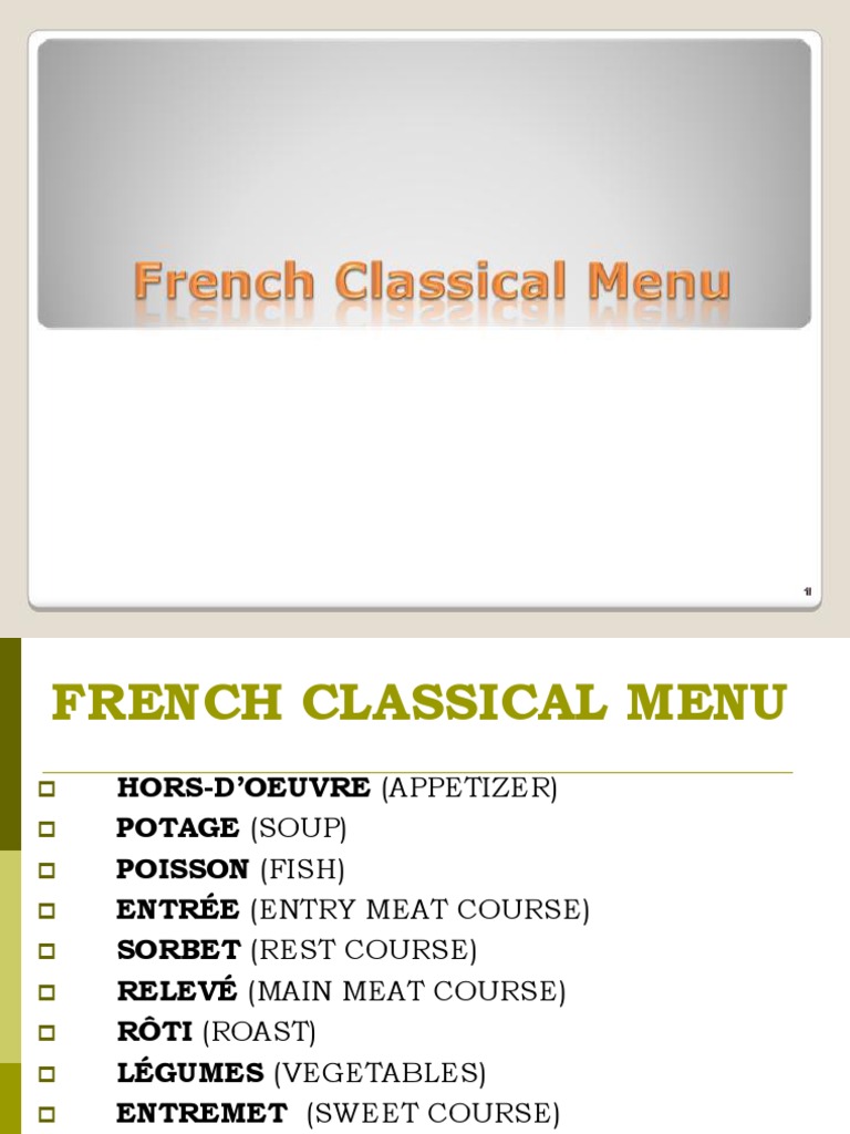 French Classical Menu Pronunciation : It is water and crushed ice slush flavoured as a rule with champagne and served in a glass. French Classical Menu Pronunciation : As time went by, these dishes started to be sent preplated from the kitchen and the menu sequence was born.